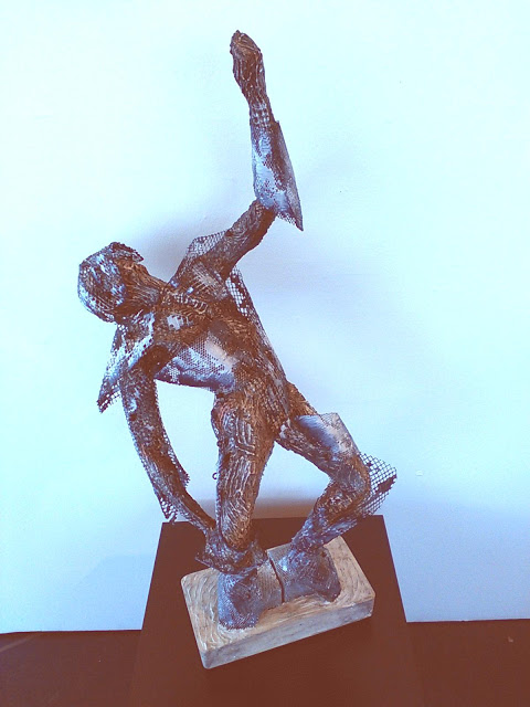 Visible traces of the raw physicality of the process of carving of images into the wood reveals the artist’s intensity, energy, vitality and singularity of purpose. We may surmise he is alluding to the conflictual and blending of cultures, as well as noting his own political views about them. With few exceptions, Sanchez limits his color palette to blacks, grays and earth tones. Two sculptural works displayed on pedestals in the center of the gallery are carved from wood and cardboard and painted. One piece “El Quinto Sol” is composed of interlocking cardboard organic shapes painted with black and white figures and body parts. The other “Rayuela”, is a wood sculpture composed of many individual wooden parts pieced together including small animals, animal heads, and pieces resembling machine parts, all painted gold.