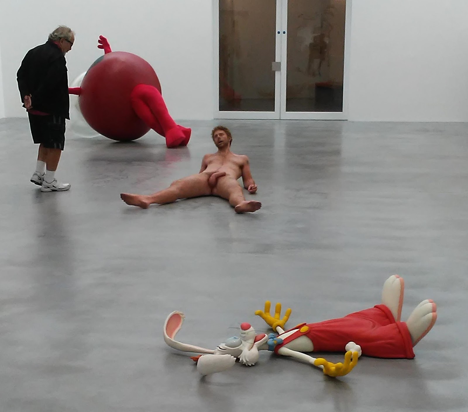 We moved on to a room of pictures and the one that grew on me was title “me & you” which you could just barely see in the smoke from the candle. But moving into the upstairs you can upon a room full of chairs which glass bubbles or whopper cushions on them. Moving close the paint appears grainy and then I realized this was GUM! Huge quantities of gum were uses in abstract works that were just delicious. Room 5 had a sprayed Wile Coyote amongst lots of funny sayings. The final room with the clown, the naked man and the Kool Aid Jug man was such a strange combination that it worked especially with the large color field pictures on opposite walls. Dan Colen is a man of many materials and seems to be master of all of them.